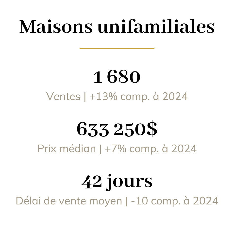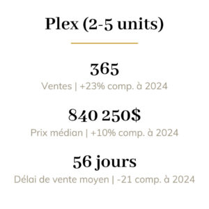 Le prix médian des maisons unifamiliales a atteint 633 250$ en août 2025, une hausse de 7% par rapport au même mois en 2024. Les copropriétés ont connu une hausse de 4%, portant leur prix médian à 422 000$, tandis que les plex (2 à 5 unités) ont enregistré une augmentation de 10%, atteignant un prix médian de 840 250$.